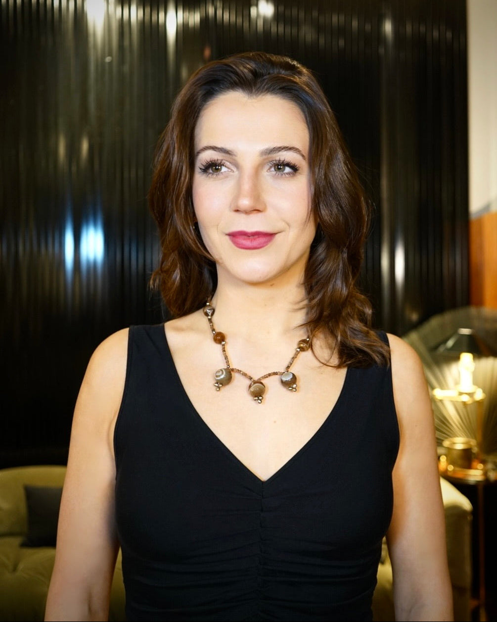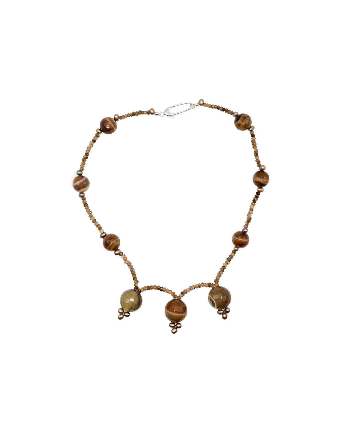 Made of andalusite, Botswana Agate, and pearl, with a sterling silver clasp.