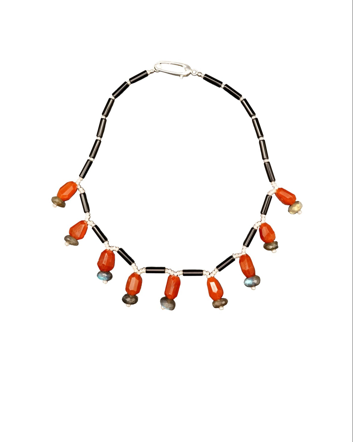 Made of carnelian, onyx, pearl, and labradorite, with a sterling silver clasp.
